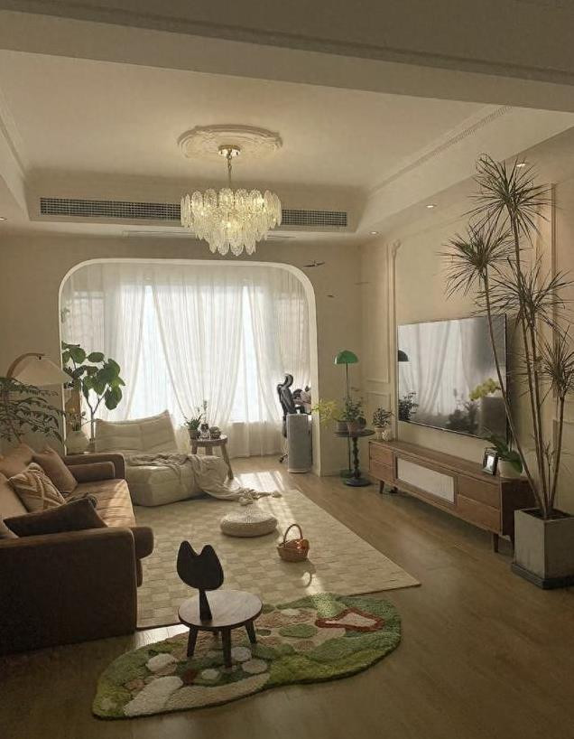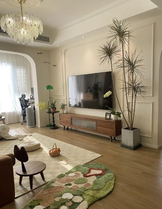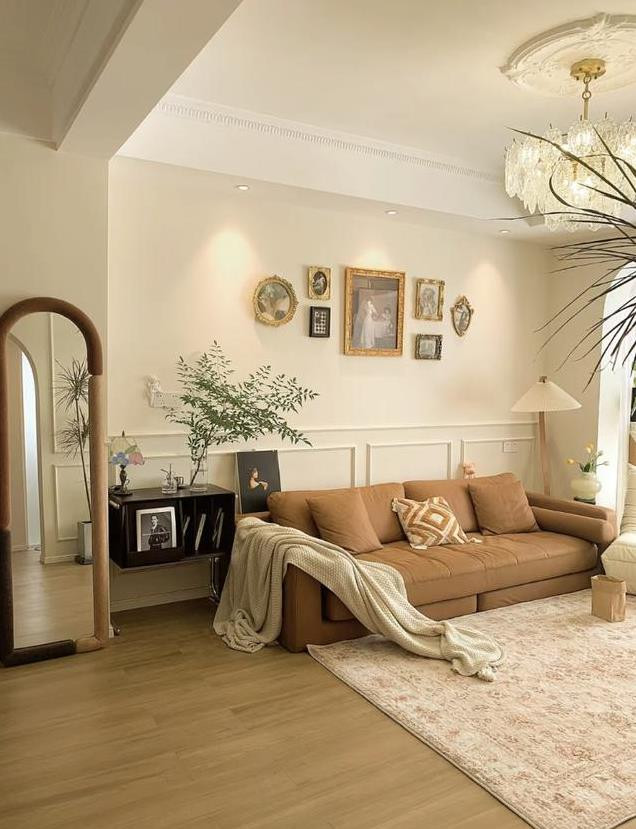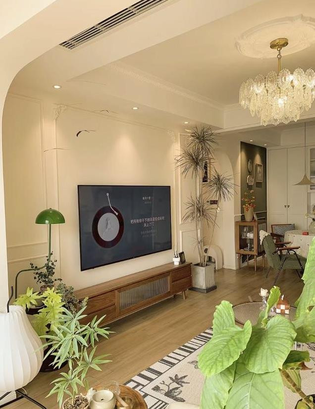 首先就是咱们的客厅,地面是颜色比较深一点的黑胡桃木色,让地面完全的沉下去,给人沉稳的感觉。墙面上就刷个乳胶漆,搭配几根石膏线条和角花,浓郁的法式复古风一下就出来了。再搭配千年木的绿植,氛围感直接拉满。