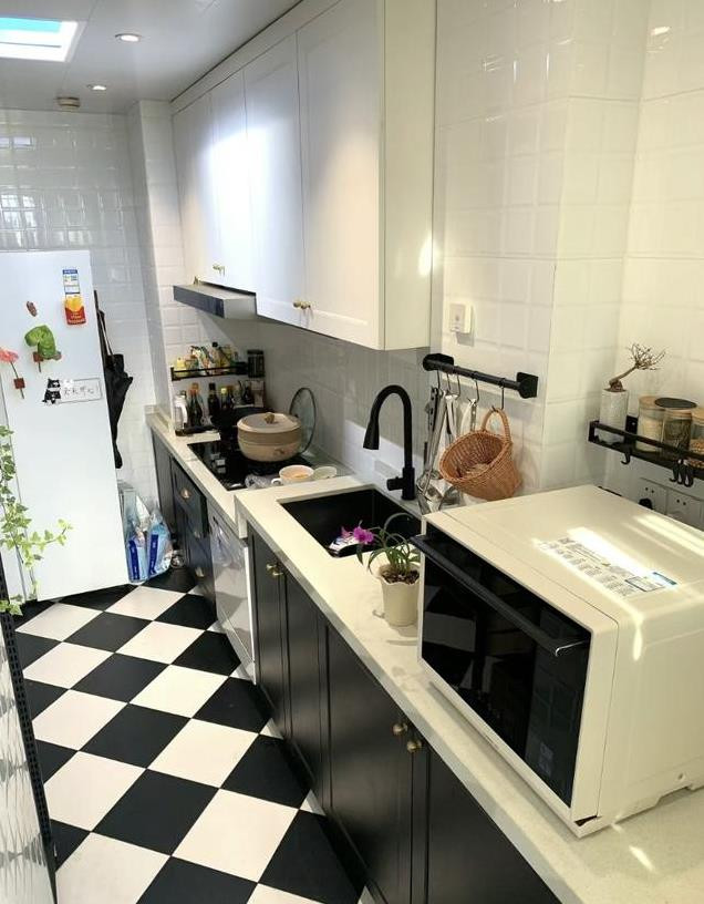 厨房一改外面比较亮眼一些的色彩搭配,而是布置成黑白灰的色调,地上黑白色系的格子砖,也特别适合打造出复古感。