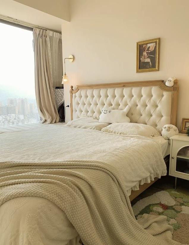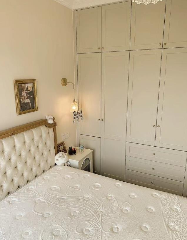 主卧原本的面积并不大,但1.8米宽度的大床一定是要备上的,舍弃掉其他的东西,比如一个床头柜,给大床腾出空间,最后的完工效果还是很不错的。