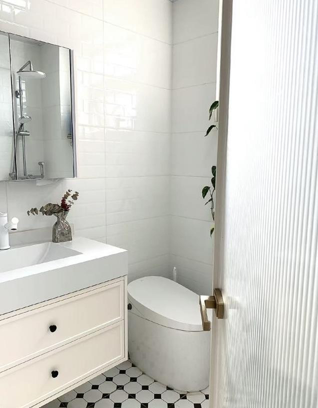 卫生间只有3平主要以实用为主,地面黑白法式地砖 30×30的,墙面30×60白色面包砖。