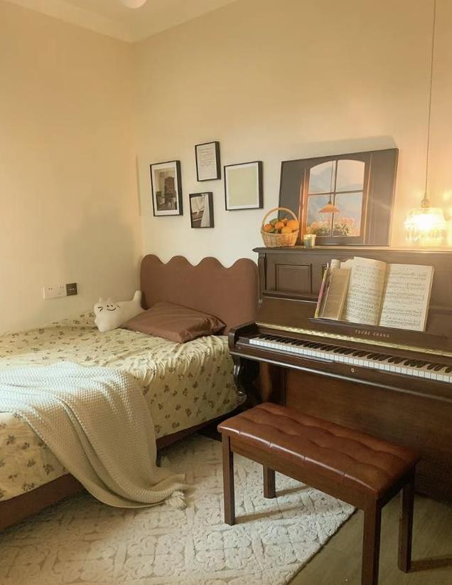 最小的卧室做了多功能的布置,1.5米宽度的饼干床靠墙摆放,剩下的空间给钢琴留出了空间,钢琴上部布置了一盏矮矮的小吊灯,让弹琴的氛围感更放松。