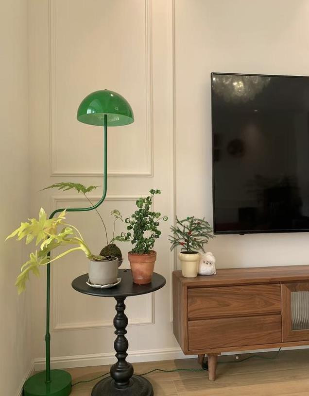 黑色带有柱状基座的小边几,复古感满满,随意的摆放几盆绿植,就很有意境。旁边是一盏绿色的落地灯,造型和材质都比较现代,给它一混搭进去,让这个角落热闹了起来。复古感咱要有,但也不能死气沉沉的,混搭是不错的选择。