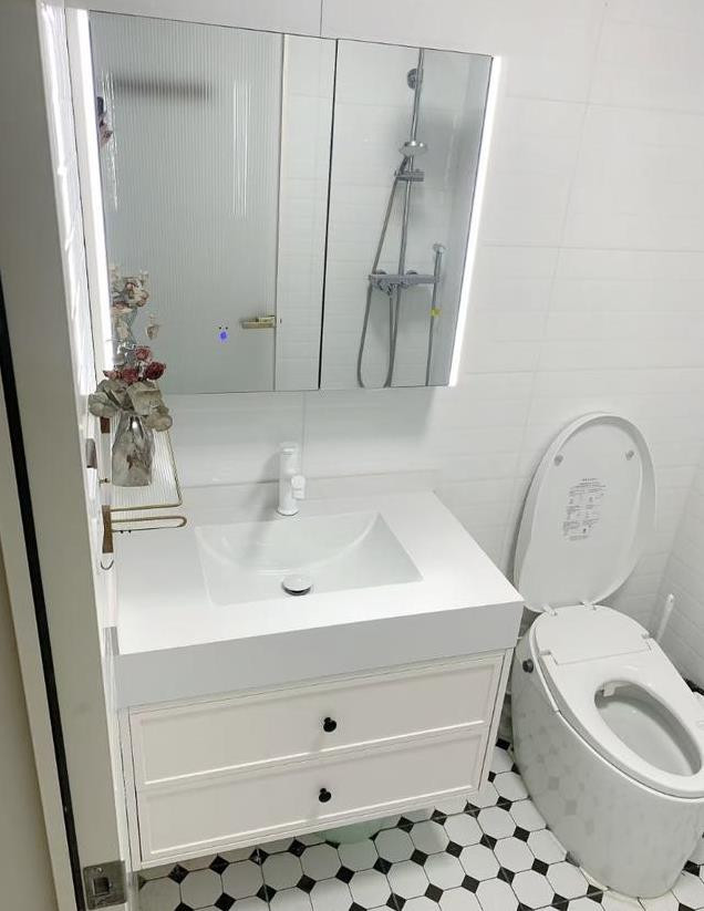 用了奶白色和白色岩板的浴室柜,两个大抽屉真的好能装很能囤货,镜子带镜柜能放下我所有的洗漱化妆用品,还自带化妆镜和美妆格,所有东西收纳起来,原本拥挤的3平卫生间也明亮宽敞了。